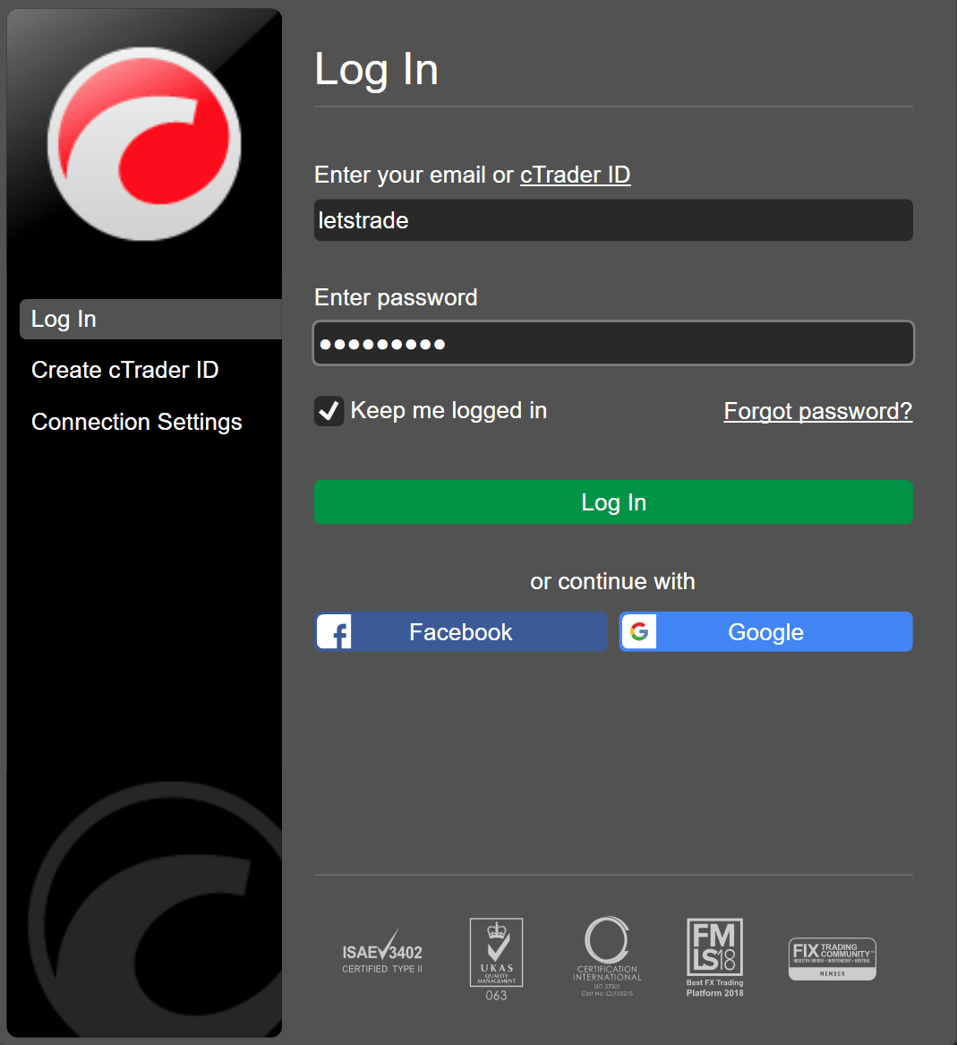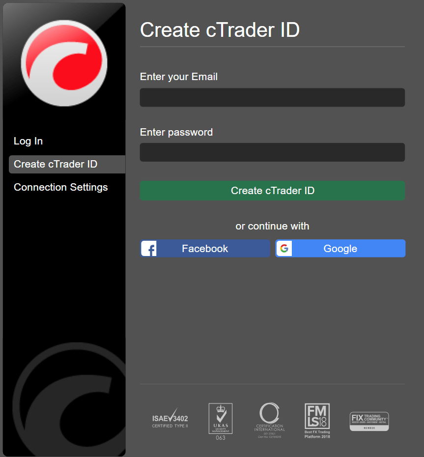 برای ایجاد cTrader ID، پس از اجرای نرمافزار، گزینهٔ Sign Up را انتخاب کنید. سپس اطلاعات مورد نیاز شامل ایمیل، رمز عبور و کشور محل سکونت را وارد کرده و دستورالعملهای تایید ایمیل را دنبال کنید.
