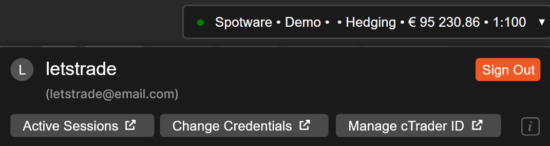 نرمافزار cTrader Windows شما را به صفحهٔ تنظیمات cTrader ID در مرورگر هدایت میکند. با ورود به وبسایت cTrader ID، میتوانید علاوه بر مدیریت حسابهای معاملاتی، اعلانها، برنامههای Open API و سایر تنظیمات مرتبط با محیط کاری را نیز مدیریت کنید.