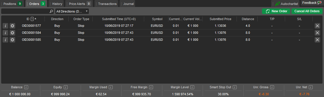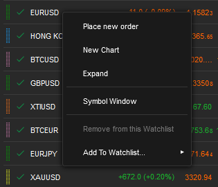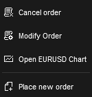 - راستکلیک روی یک سفارش، دسترسی به گزینههای Cancel, Modify, Open Chart و Place New Order را فراهم میکند.