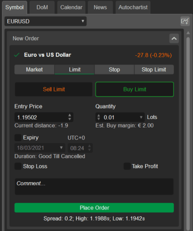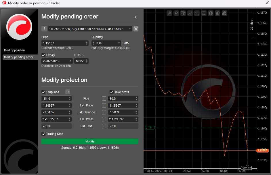 - در صورت نیاز، Expiry و گزینههای SL و TP را تنظیم کنید.