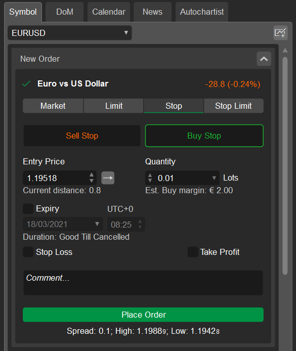 - نماد و جهت معامله (Buy Stop یا Sell Stop) را انتخاب کنید.