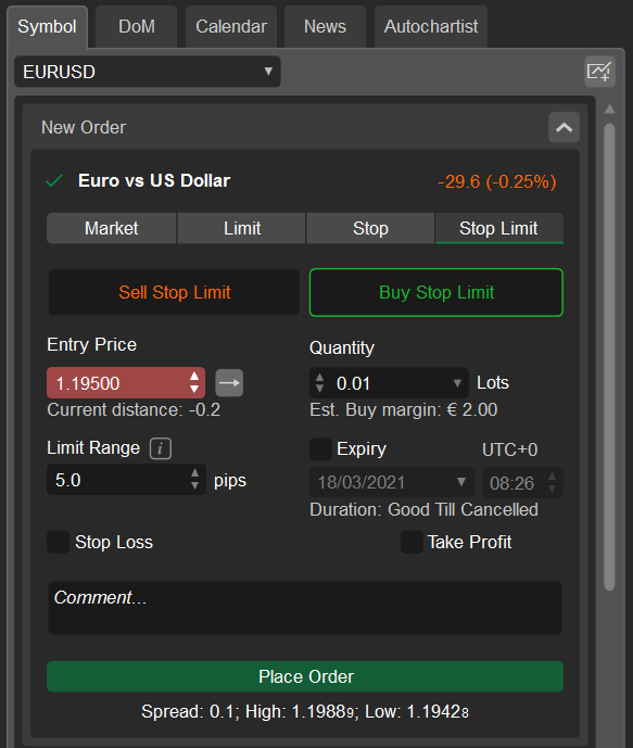 - نماد و جهت معامله (Buy Stop Limit یا Sell Stop Limit) را انتخاب کنید.