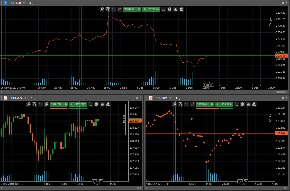 - نمودارها (Charts): نمایش قیمت نمادهای انتخاب شده به صورت نمودار. میتوانید چندین نمودار روی صفحه اصلی باز کنید و مستقیماً سفارش ایجاد کرده یا موقعیتهای باز را مدیریت کنید.